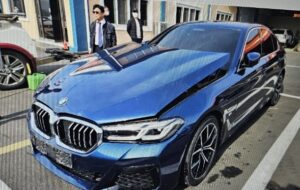 VIN : WBA51AG09MCF46220 – BMW 530e – Accident involving a driver falling asleep at the wheel and driving off the road to the right, crashing into a fence .