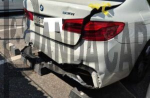 VIN : WBAJD3109JG970198 – BMW 530i – The front and rear of the vehicle in the middle of a 3-car collision before the total loss was reported . The 3rd muffler fell off. The mileage is unknown (no photo/random input). Please check the original.